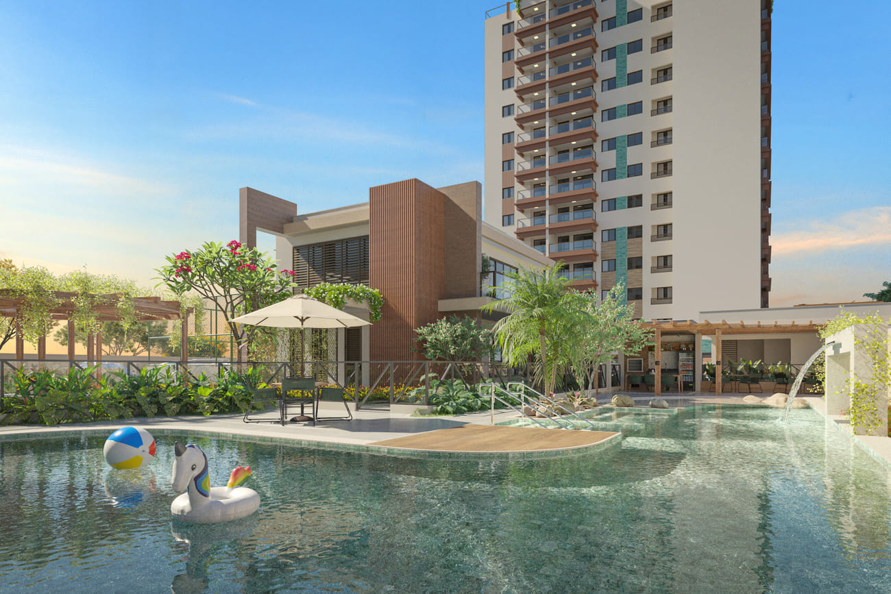 Piscinas, prainha e convivência integrada ao verde.